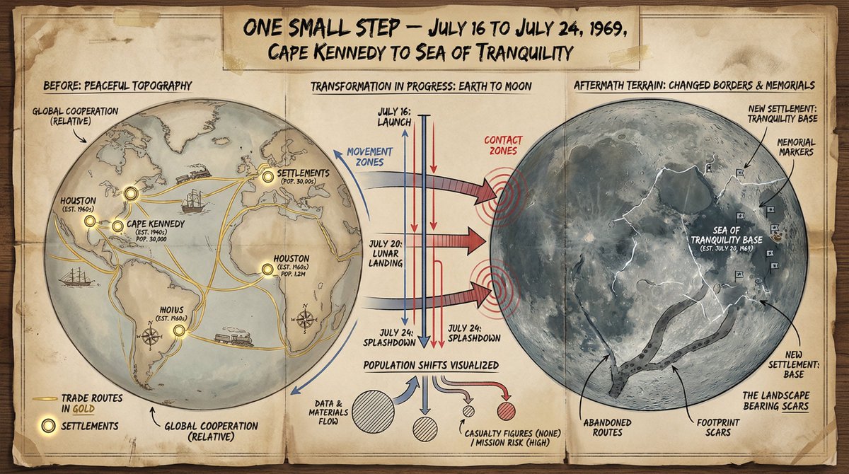 Generates a cartographer's crisis board, depicting a historical event or region. The left section illustrates a peaceful topography with gold trade routes and marked settlements.