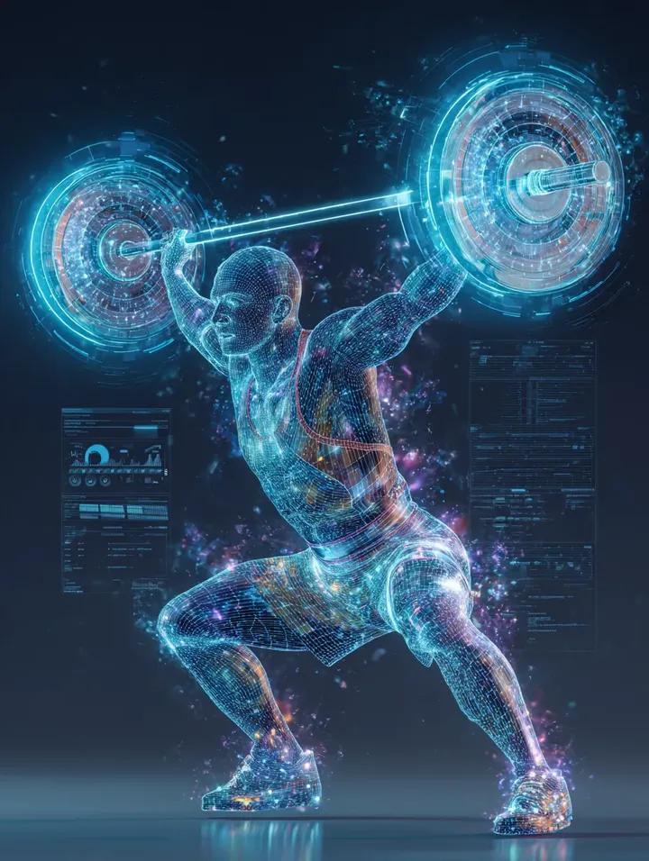 futuristic weightlifter performing clean and jerk, full body, body made of transparent mesh and glowing wireframe, holographic data interface surrounding the athlete and barbell, performance metrics UI (force output, muscle activation, stability) floating around, energy burst effect, neon blue color...