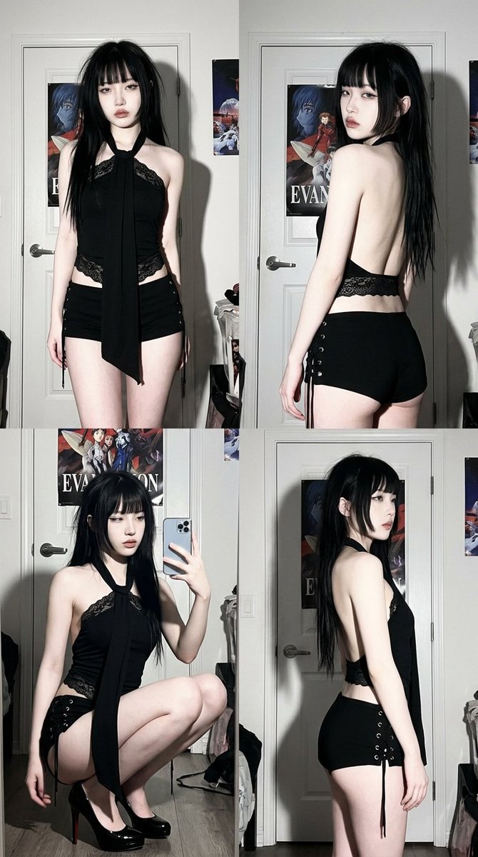 This prompt generates a multi-panel collage of a young woman in edgy black apparel, captured through casual smartphone mirror selfies in a messy bedroom with harsh lighting. It emphasizes an anime-core, e-girl aesthetic with detached confidence.