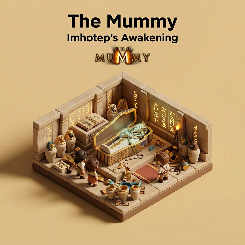 Generates a 45° top-down isometric 3D cartoon diorama of a movie scene, featuring soft textures, PBR materials, and lifelike lighting on a raised base with customizable text overlays.
