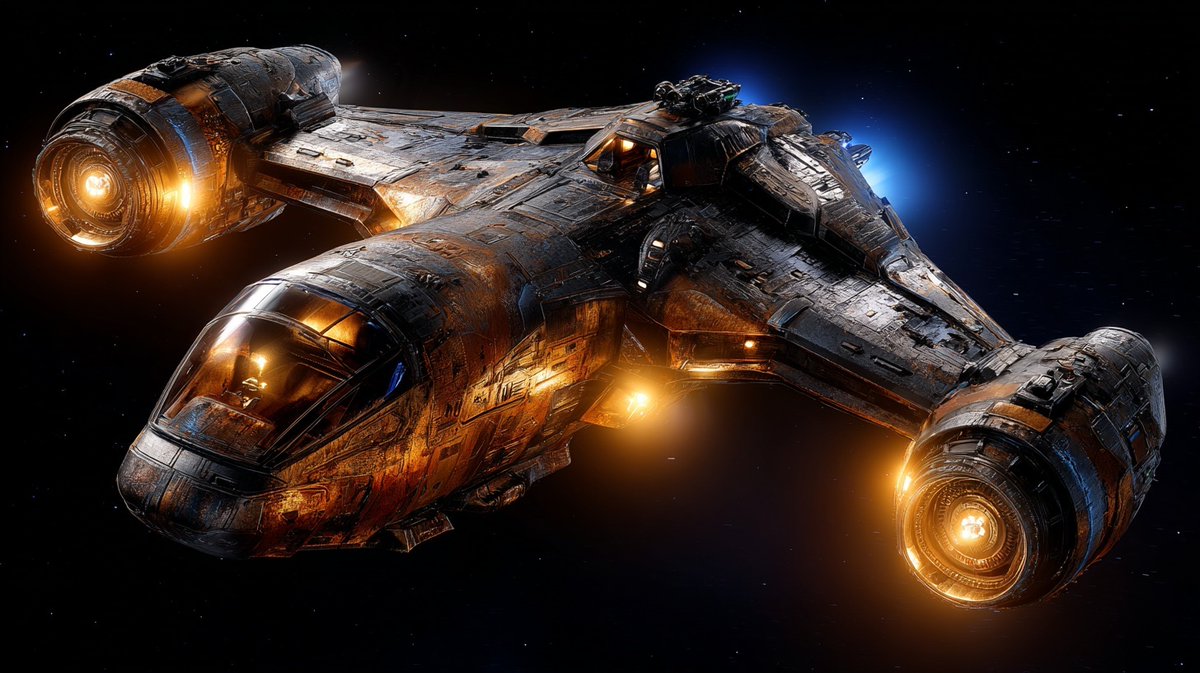This prompt generates photorealistic images of a battered futuristic starship with intricate details, glowing thrusters, and an amber cockpit glow, set against a deep space backdrop with a Blade Runner-inspired color palette.