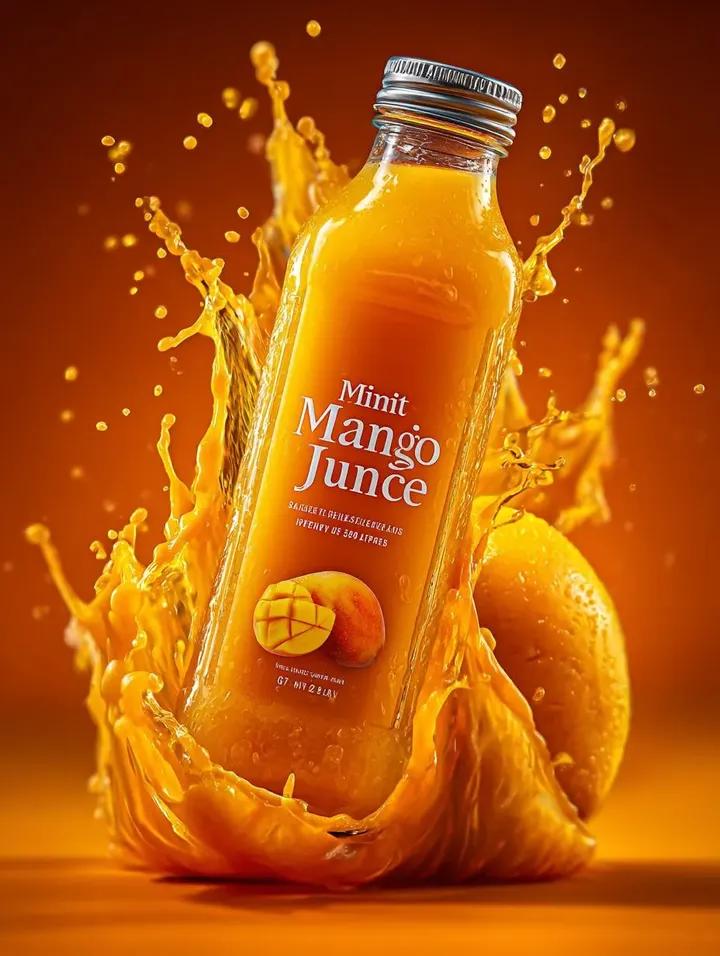 In mid-air, a juicy ripe mango bursts explosively, spraying golden-orange pulp and juice droplets outward, a "Minute Maid Mango Juice" bottle surges out of the core. Captured in sharp high-def product photography style, studio lighting, Sony A7s aesthetic. Background is warm golden orange.