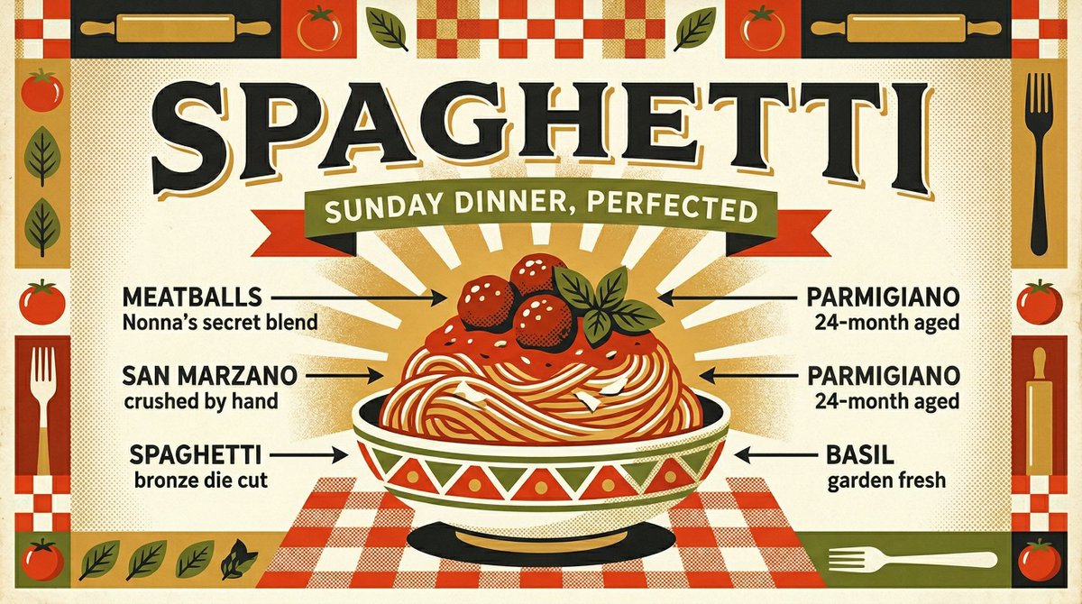 Generates a stunning 1950s golden age travel poster featuring a hero dish. It uses bold flat graphic design with a rich, limited color palette.