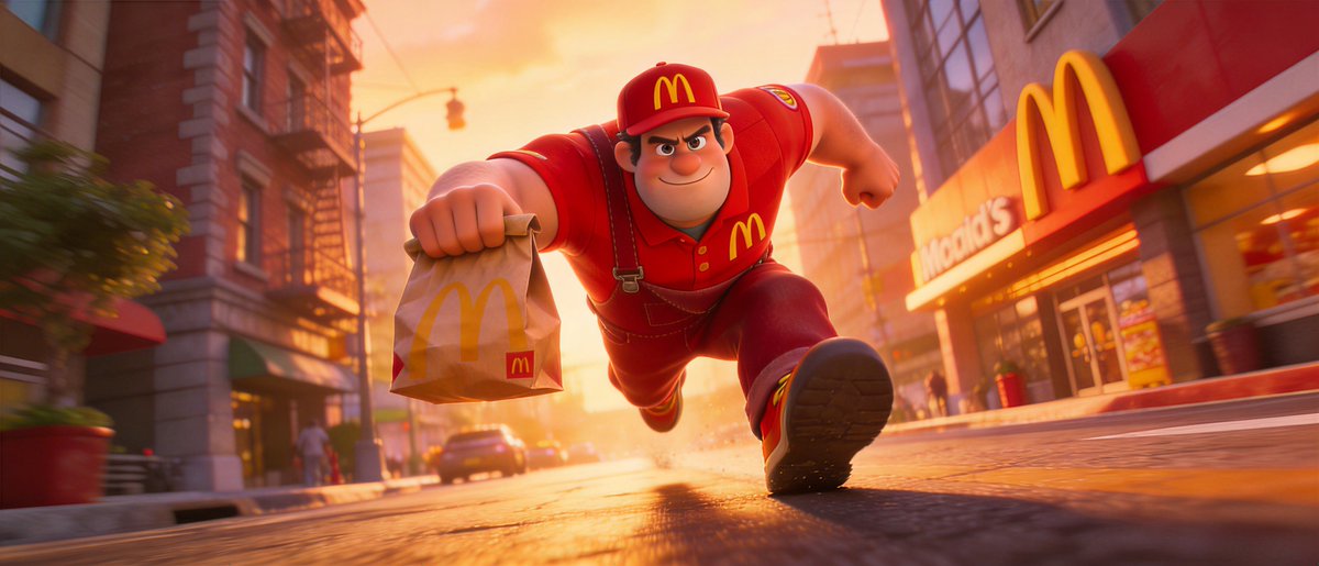 Generates a stylized 3D cartoon realism image of a McDonald's delivery character. Features an extreme ultra wide-angle lens with aggressive exaggerated perspective.