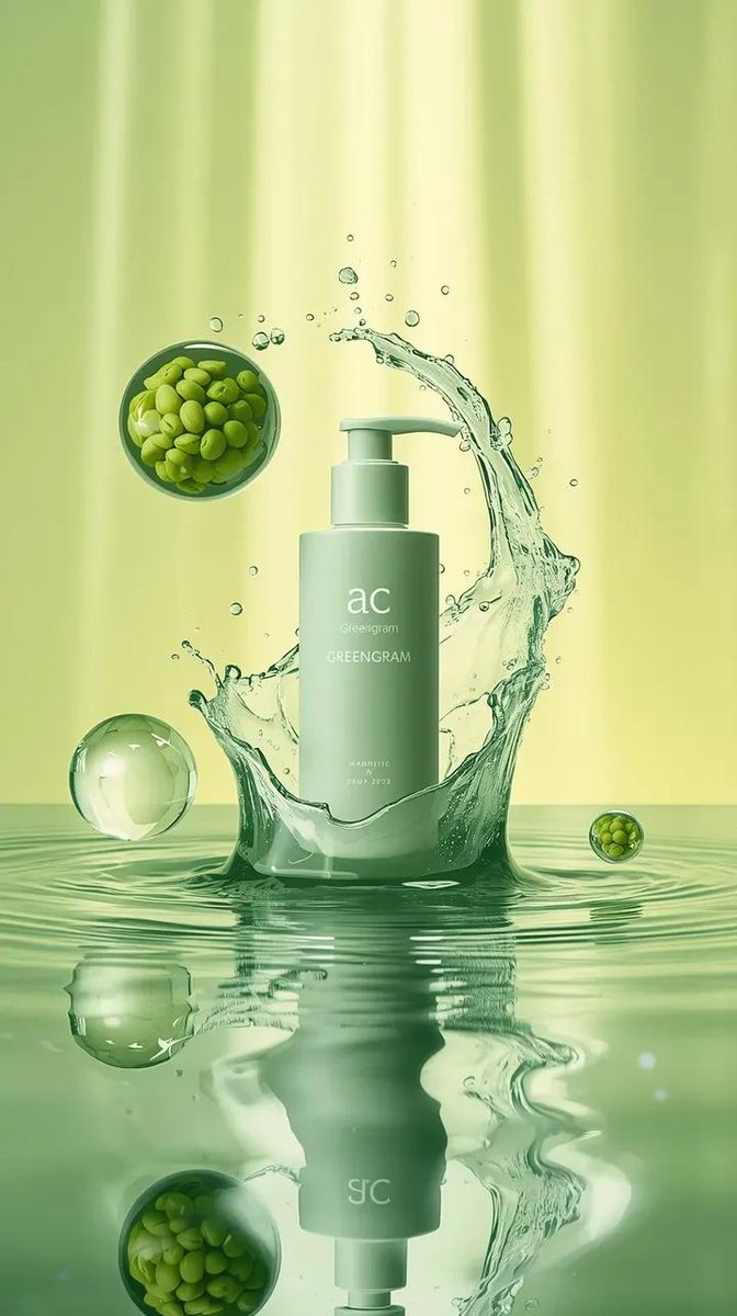 Create a high-end cinematic [skincare] advertisement based on the provided image. The scene opens with a [calm reflective] water surface, soft ripples moving slowly. The [mint-green] “[ac GREENGRAM]” bottle stands perfectly centered, upright and