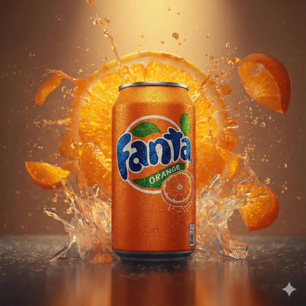 Generates a hyper-realistic product shot of a classic Fanta orange soda. The image aims for a professional, high-quality photographic style.