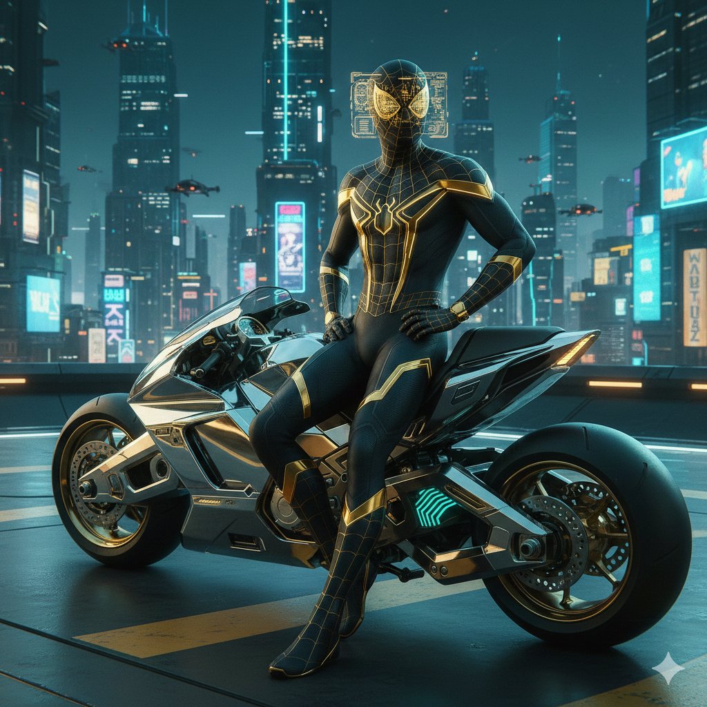 "prompt": "Luxury high-tech cyberpunk Spider-Man in a sleek matte black suit with gold neon accents and carbon fiber texture. Leaning against a chrome sports hoverbike on a rooftop helipad, city skyline glittering below. Mask lenses displaying golden holographic interfaces, confident pose, elegant and expensive aesthetic, sharp details, teal and gold color scheme."