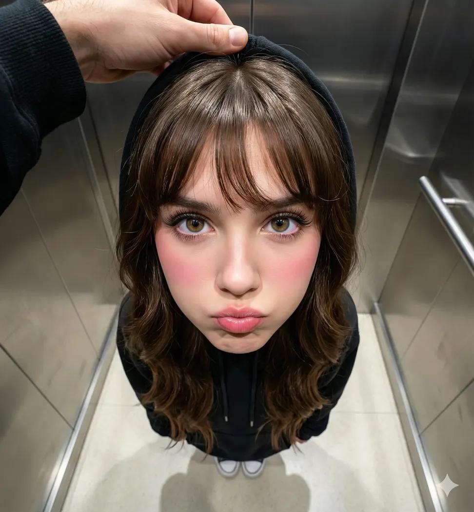 A high-angle, top-down POV shot of a [young woman] standing in a [minimalist elevator]. She has long wavy [brown] hair with wispy bangs, wearing a [black] [oversized hoodie] with the hood partially