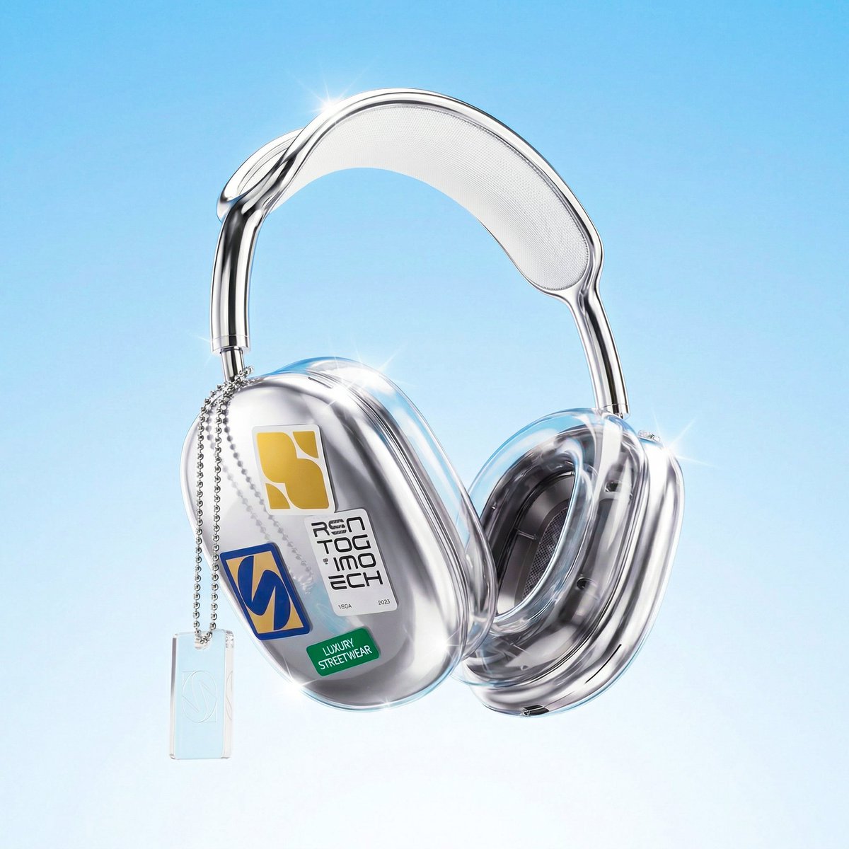 Hyper-polished 3D render of futuristic [over-ear headphones] floating, [chrome silver] frame with [transparent glossy] earcups. Each earcup features [3–4] premium [futuristic fashion] stickers, [minimal graphic design, flat]