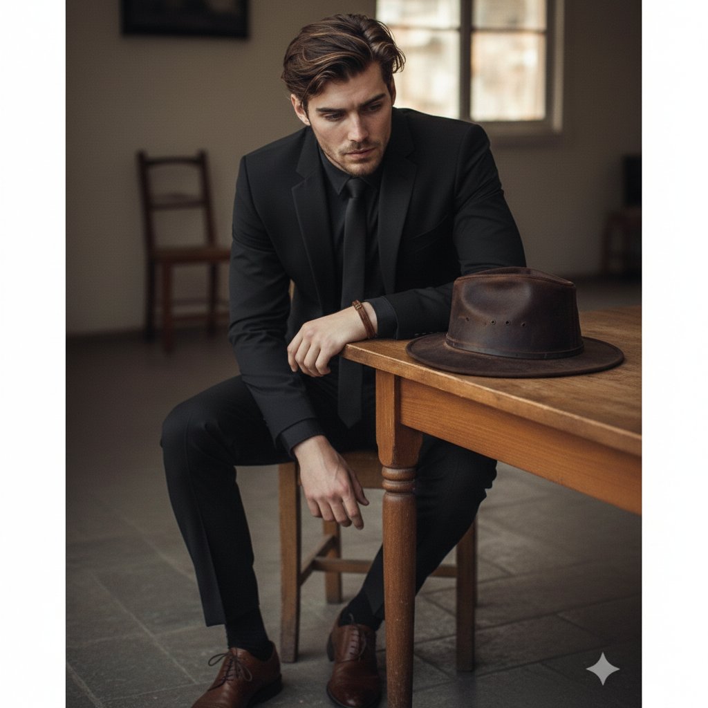 A high-quality, full-body shot of the [man] from the reference image. He is sitting on a [wooden] chair at a table in a [dimly lit] [room], leaning his right arm on the table in a [deep, thinking] pose. He is wearing a full [black] [formal] suit,