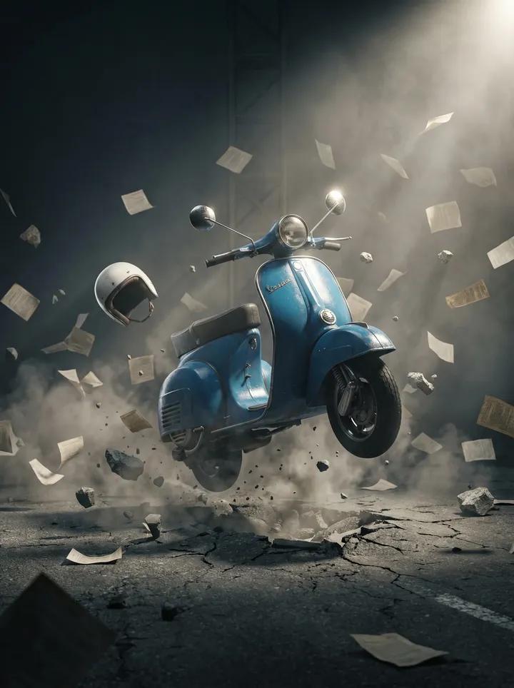 A hyper-realistic cinematic scene of a vintage [blue] [Vespa-style scooter] suspended mid-air after an explosive ground impact. The scooter floats above [cracked asphalt] with dust clouds, flying stones, broken
