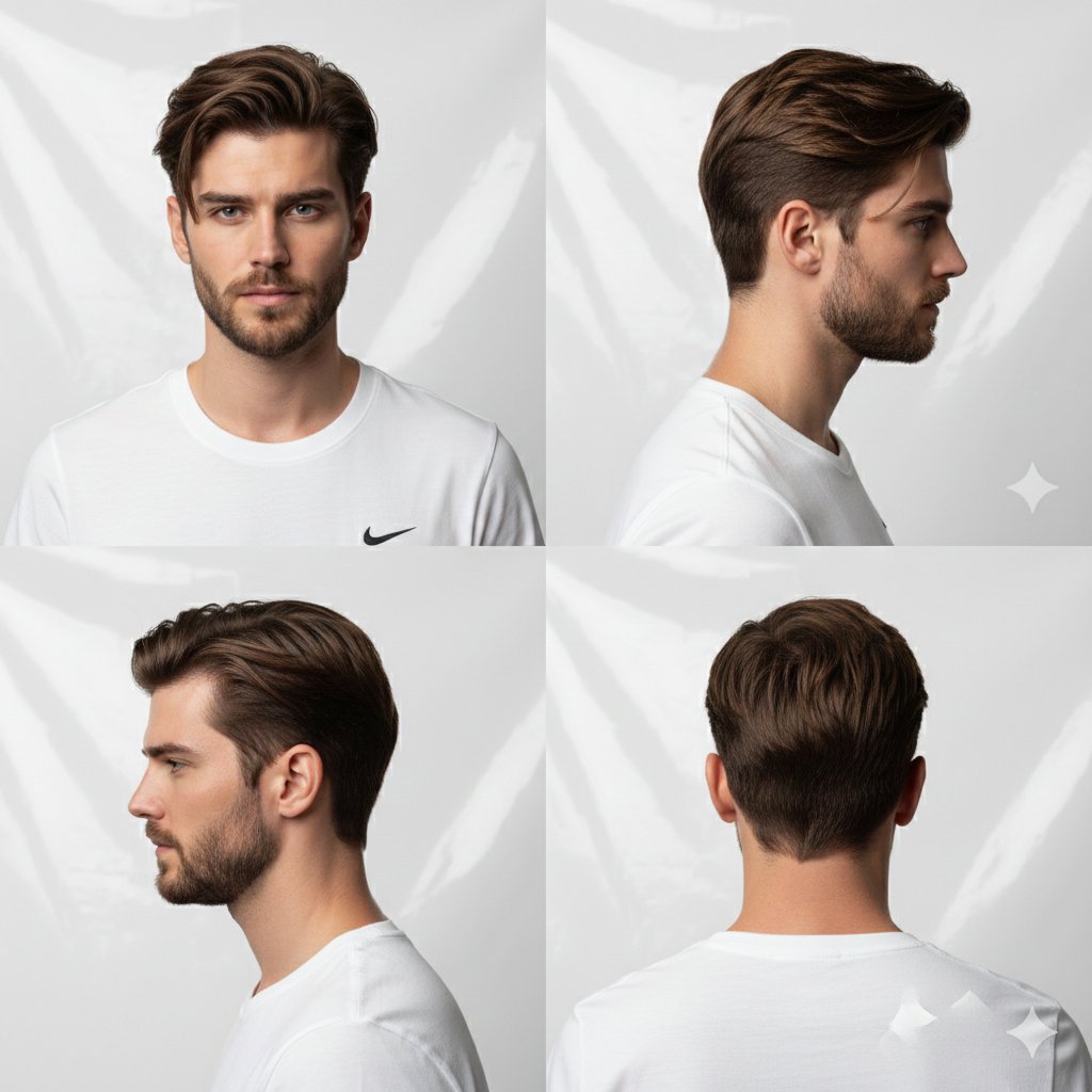 Make a photorealistic [2x2 grid] arranged in a 1:1 square format studio photograph of the [man] use image for reference , wearing a [white] [Nike] t shirt and a [modern fade haircut] against a [white] [cyclorama glossy background]. The four panels show