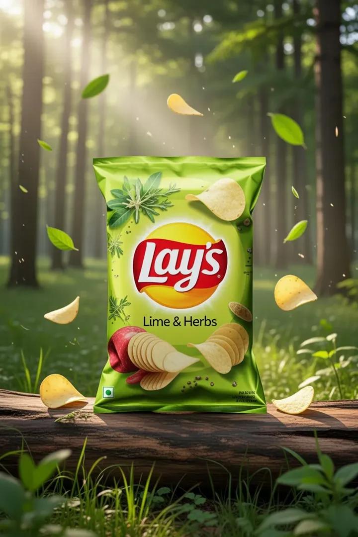 A premium outdoor food advertisement featuring [Lay's Lime & Herbs chips packet] placed on a [wooden log] inside a [green forest]. Sun rays passing through trees, [fresh and natural] mood. The packet looks larger and eye-catching.
