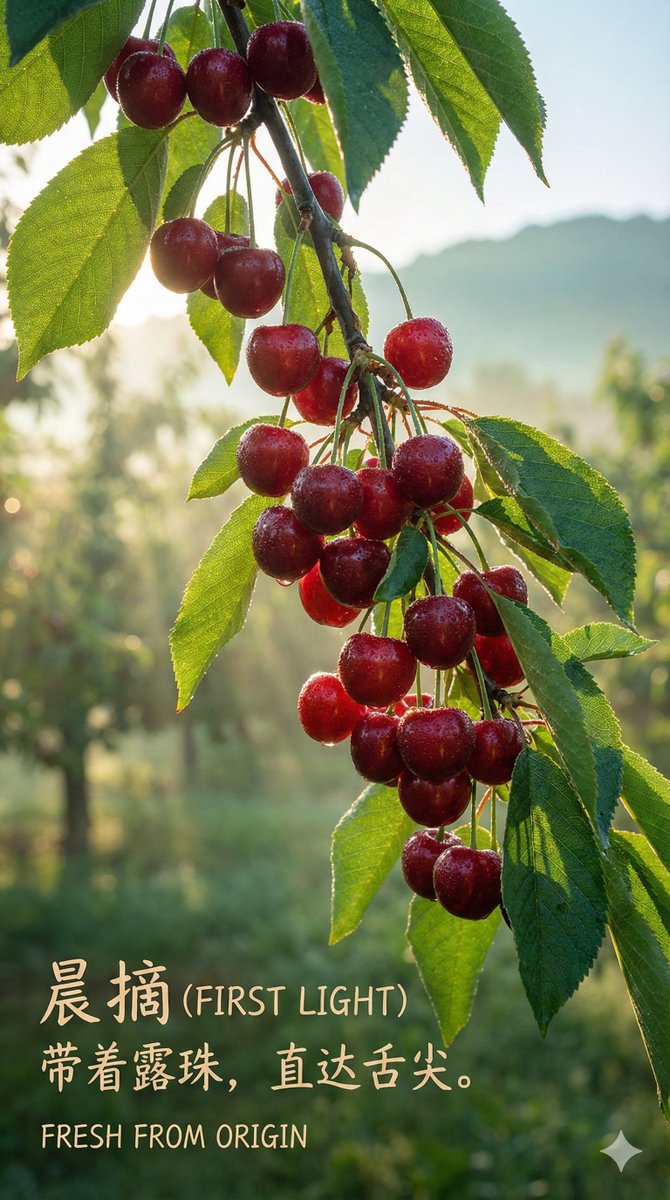 Subject: [Two top-grade cherries, deep red, almost black], close together, with vibrant green stems connected. Details: Under a macro lens, the skin surface exhibits an extremely smooth, mirror-like texture, clearly reflecting the studio light source. A tiny, crystal-clear water droplet rests precariously on the roundest part of one of the fruits. Lighting: Fine professional jewelry photography lighting. Use a softbox to create sharp and clean long strip highlights, perfectly outlining the spherical curve and deep color of the fruit. Colors: Deep ruby red, ink black, highlight white, vibrant green (stem). Atmosphere: Extreme temptation, preciousness, luxury, mouth-watering. Technical Parameters: Macro photography, extremely shallow depth of field (focusing on the water droplet and highlights), 8K resolution, extreme sharpness, --ar 4:5 --v 6.0 [ 🖋️ Copywriting and Layout ]