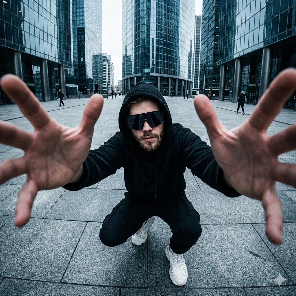 A high-angle, wide-angle street photography shot of a [man with a beard] crouching in a [city plaza]. He is wearing a [black hoodie with the hood up], [oversized black shield sunglasses], and [black cargo pants with white sneakers]. He is reaching