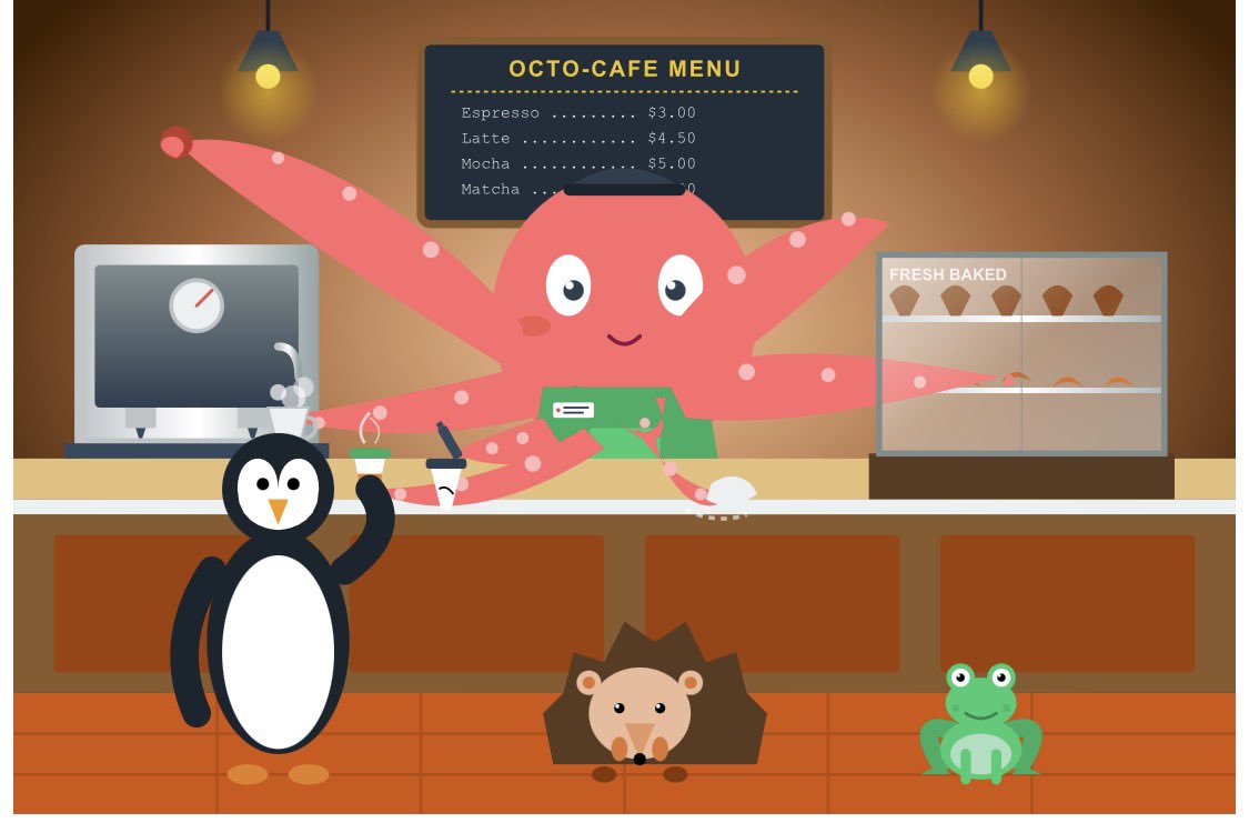 Generate a single [SVG] of an [octopus] working as a [barista] behind a [coffee shop counter]. Each of its 8 tentacles is