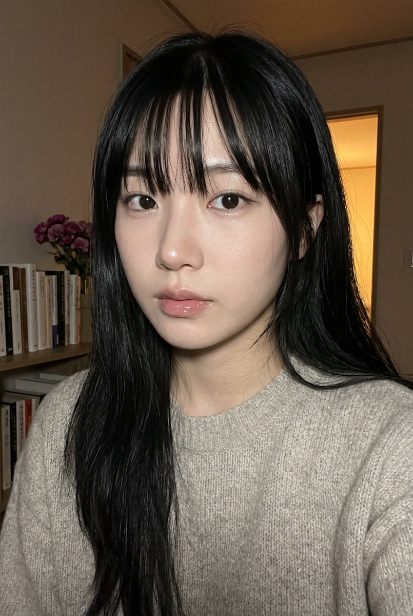 A close-up realistic social-media style portrait of a [young woman] with [black] [long hair and heavy bangs], photographed [indoors at night] with a [quiet, intimate presence]