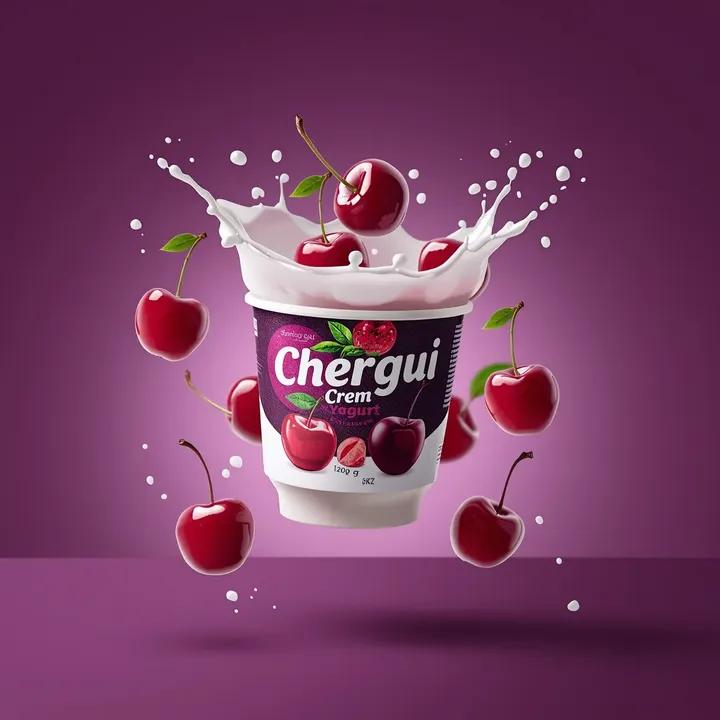High-end commercial product photography of a [yogurt cup] labeled “[Chergui Crème Cherry Yogurt]”, captured mid-air with the cup slightly tilted and the [foil lid]