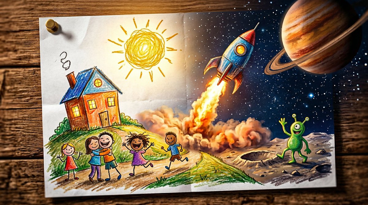 This prompt generates an epic 3D scene where a child's naive crayon drawing erupts into the real world, transforming simple lines into tangible objects with warm lighting.