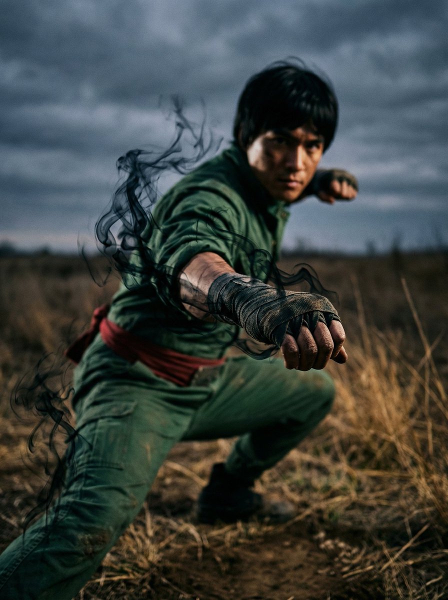 A Cinematic hyper-realistic full-body shot of a [powerful martial artist] in a [dynamic kung fu stance], inspired by [Rock Lee]. He wears a fitted [forest green] tactical jumpsuit with a [red] sash at the waist and weathered hand wraps.