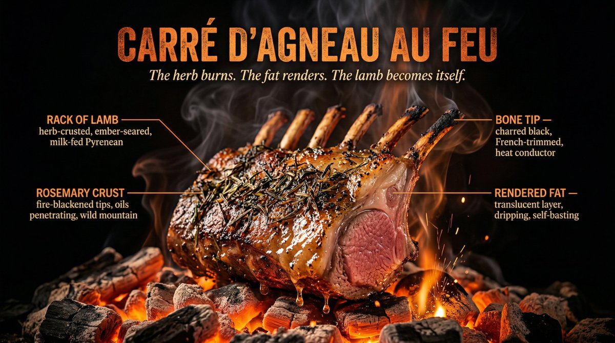 emerging dramatically from darkness, resting directly on glowing orange-red embers, live fire cooking photography. Pure black background, single dramatic light source from the embers below casting upward warm amber glow on every surface. Smoke wisps rising and curling dramatically catching backlight. Hero [Grilled Steak] center, char marks glistening, fat rendering and dripping onto embers creating micro-flame bursts frozen in time, every texture hyperreal at the moment of peak perfection. Each ingredient labeled with thin ember-orange lines extending into darkness: "[Asparagus grilled, tender-crisp, locally sourced]". Dish name in bold fire-branded typography: "[Ember Kissed Steak]". Subtitle: "[A Symphony of Fire and Flavor]". Mood: Francis Mallmann open fire meets Noma foraging meets Annie Leibovitz dramatic portraiture. 4K, tack sharp, ember underlighting, smoke atmosphere, extraordinary and craveable.