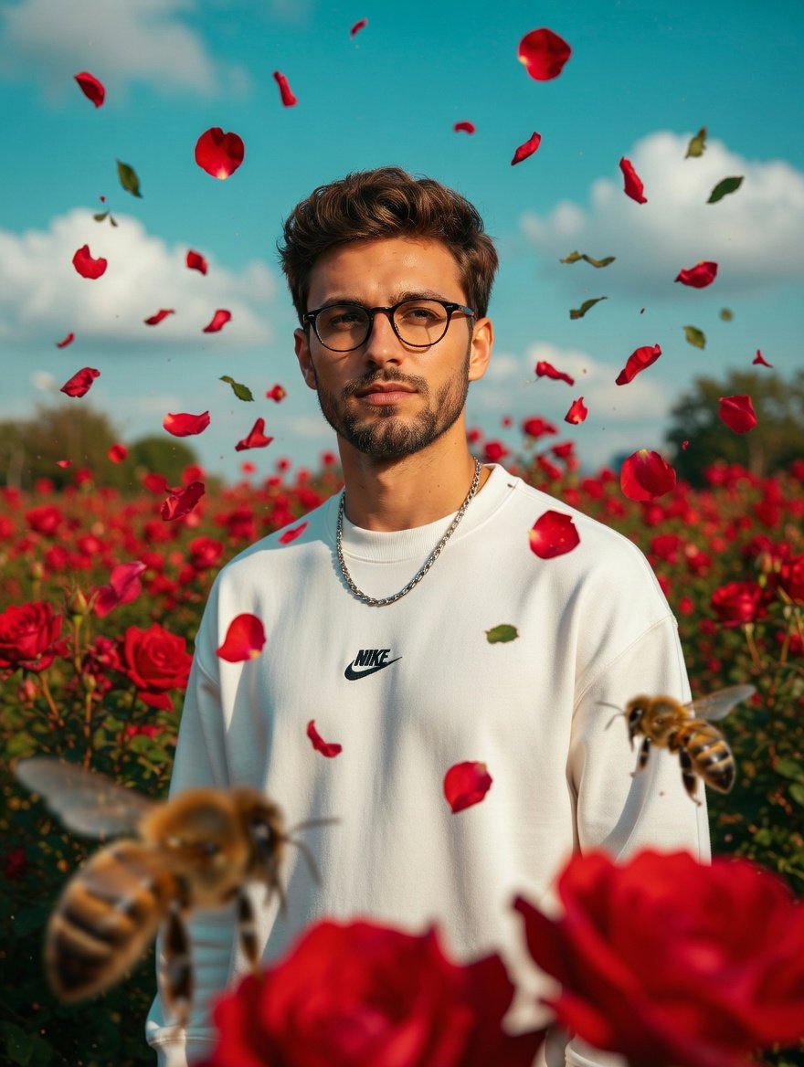 A hyper-realistic cinematic medium shot of a [young man] with wavy brown hair wearing a [minimalist white Nike sweatshirt], standing in a [vibrant field of red roses]. Hundreds of red roses petals and small leaves are caught in mid-air, swirling around him as if suspended in a light breeze. In the foreground, large blurred honeybees and flowers create a soft bokeh effect. The sky is a [bright teal-blue] with soft, fluffy white clouds. High-contrast lighting, sharp focus on the man's face, professional color grading with a [warm teal and orange] palette, 8k resolution, shot on 35mm lens.