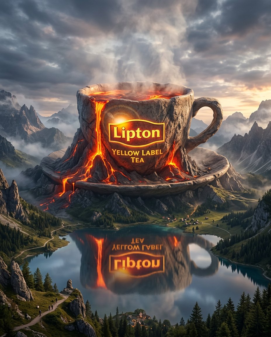 A colossal [mountain] shaped like a [ceramic] [Lipton] [teacup], with glowing [lava] flowing down the sides like steeped tea. The [Lipton] logo is prominently displayed and large, carved clearly into the rocky surface and illuminated by the light of the [lava]. Steam rises from the top naturally, as if the [mountain] is brewing tea. The surrounding clouds and valleys add a dreamy quality, while a serene lake reflects the entire scene. Highly detailed, fantasy realism with volumetric fog and a strong product presence.