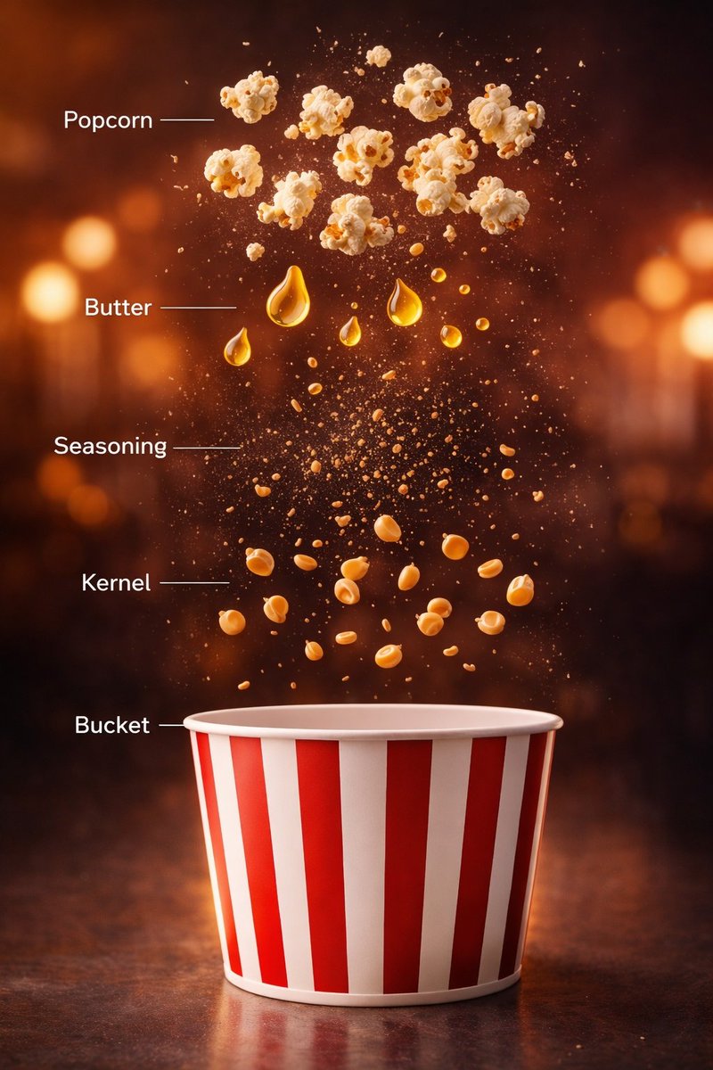 Generates a hyper-realistic, 8K cinematic product photograph of a popcorn bucket overflowing with golden buttery popcorn against a movie theater background, emphasizing crisp texture and rich detail.