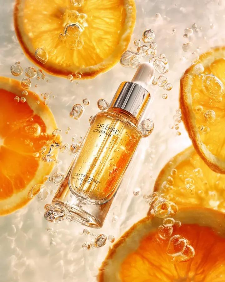Clean macro product photo, high-end [Estée Lauder] inspired aesthetic, [golden] [serum] inside a [clear glass] [dropper bottle] (no label), suspended in a crystal-clear acrylic tank with elegant bubbles ascending, surrounded by [orange] slices with juicy pulp texture, rim light accentuating radiant glow, high-key, pure, glossy reflections, clinical-grade composition, [soft white] background --no label, text, clutter.