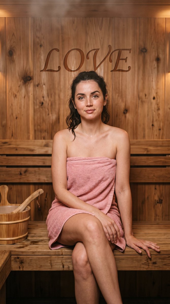 "primary_subject": "young woman resembling [Sydney Sweeney] sitting in a sauna",