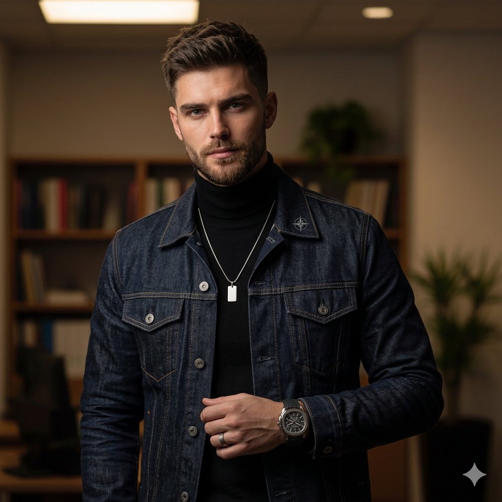 A hyper-realistic medium shot of a [handsome man] with a groomed beard and styled hair, wearing a [dark indigo raw denim trucker jacket] over a [black turtleneck sweater]. He is wearing a silver dog-tag pendant necklace and a luxury black-strap chronograph watch. On the collar of the denim jacket is a small, subtle embroidered compass star logo. The lighting is dramatic Chiaroscuro style with soft shadows, highlighting the high-quality PBR textures of the denim stitching. Background is a [blurred, warm-toned office or library with bookshelves and a potted plant], creating a soft bokeh effect. Shot on an 85mm lens, 8k resolution, cinematic editorial fashion photography.
