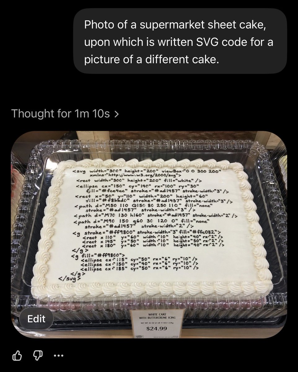 a photo of a [cake] decorated with SVG that when transcribed to a file renders another [cake]