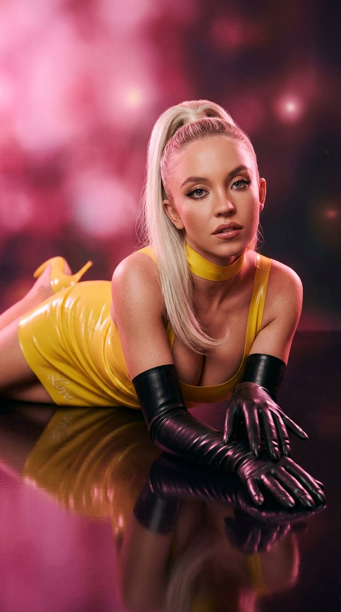 Vertical portrait of a platinum blonde woman resembling [Sabrina Carpenter] with a high ponytail, wearing a tight shiny [hot pink] [latex] mini dress, long black gloves, matching [hot pink] high heels and choker, frontal view lying on a glossy floor looking into the camera with elbows supporting the body, small elegant '[Love]' embroidered on the lower border of the dress, dreamy [pink] studio lighting, photorealistic, ultra-detailed textures, glamorous fashion aesthetic, 8k