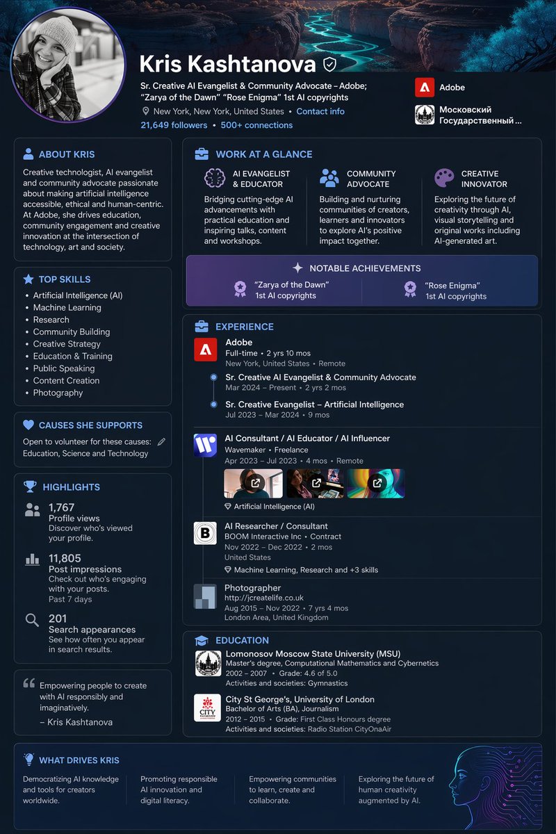 Knowing everything you know about [Kris Kashtanova]. Make a detailed infographic about her work and make a CV