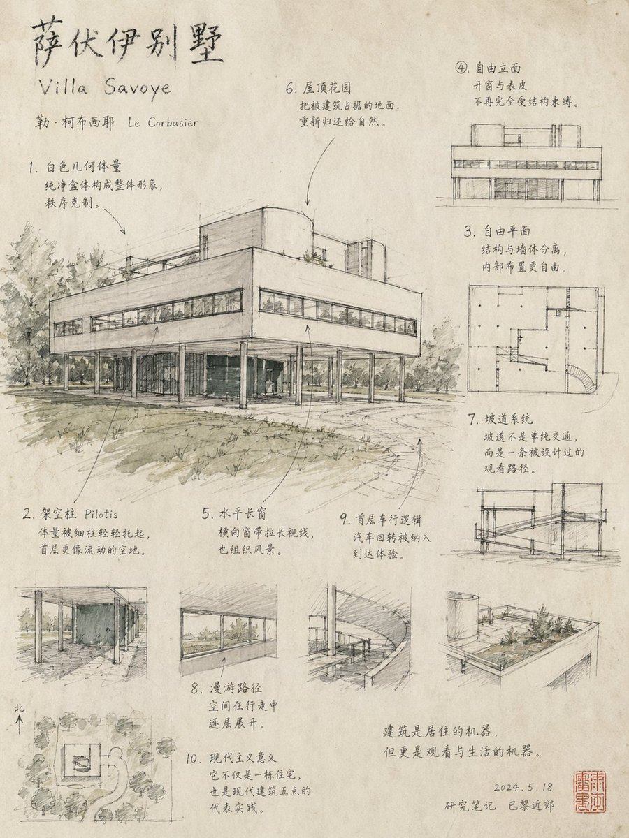 The entire image is a "hand-drawn architectural study page," but it must be more research-oriented than a regular illustration; at the same time, it should not be as densely packed as a strict infographic.