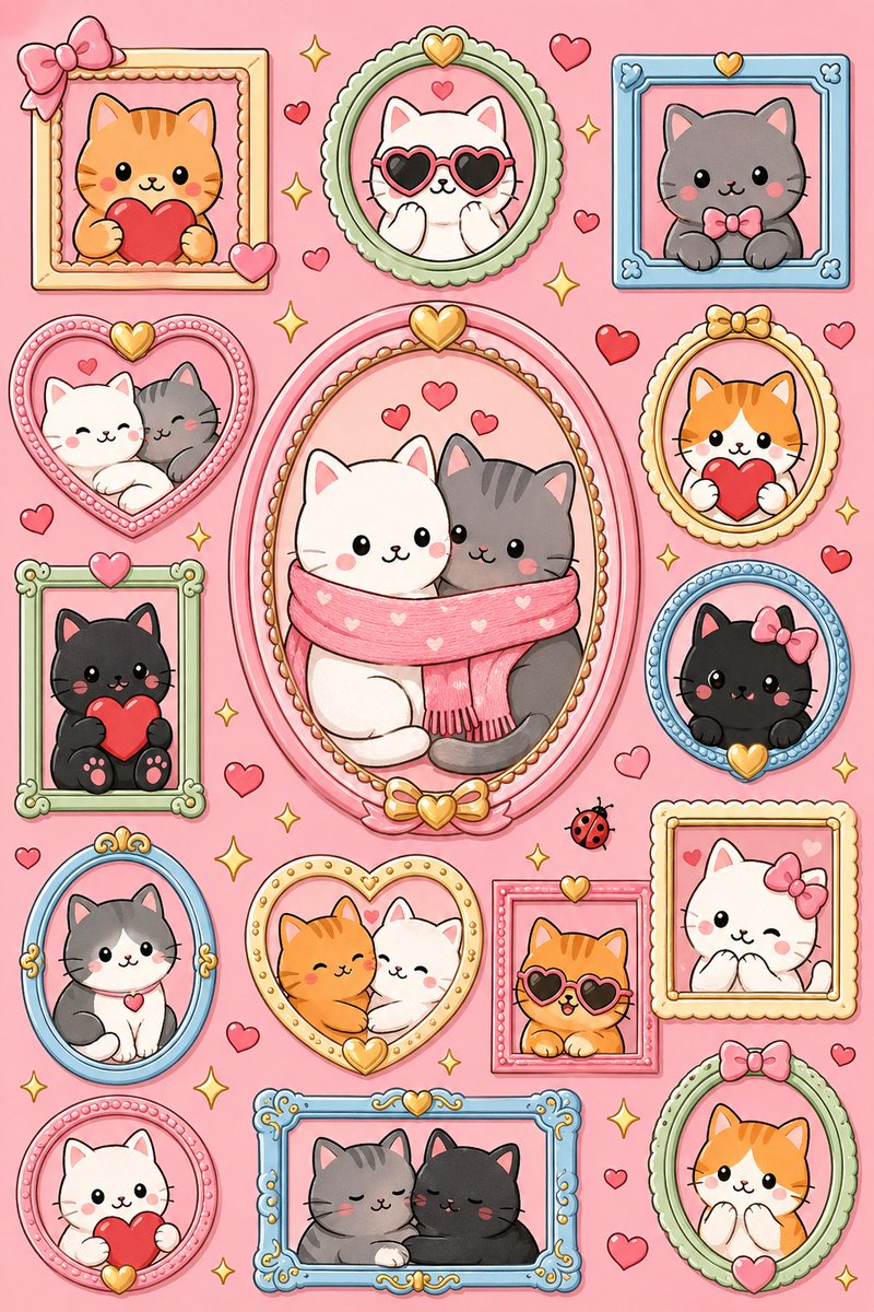 [cute healing kawaii cat] illustration, vertical 2:3 composition, [pink] solid background. The scene is like a cat photo frame wall, composed of multiple frames of different shapes: oval, round, square, rectangular, heart-shaped, with frame colors like pink, light blue, light green, cream yellow, gold, and other [macaron] colors. Each frame contains plump and cute cartoon cats: white cats, orange cats, gray cats, black cats, some holding red hearts, some two cats snuggling together, some wearing heart-shaped sunglasses or bows. A larger oval frame is placed in the center, with two cats intimately sitting together, wearing pink scarves. The overall style is [flat cartoon sticker] style, with thick black outlines, soft shadows, simple and cute expressions, dot eyes, blush, and a small smile. The background is scattered with many red and pink small hearts, golden sparkling stars, and a small ladybug can be added for embellishment. The picture is sweet, warm, childlike, clean, no text.