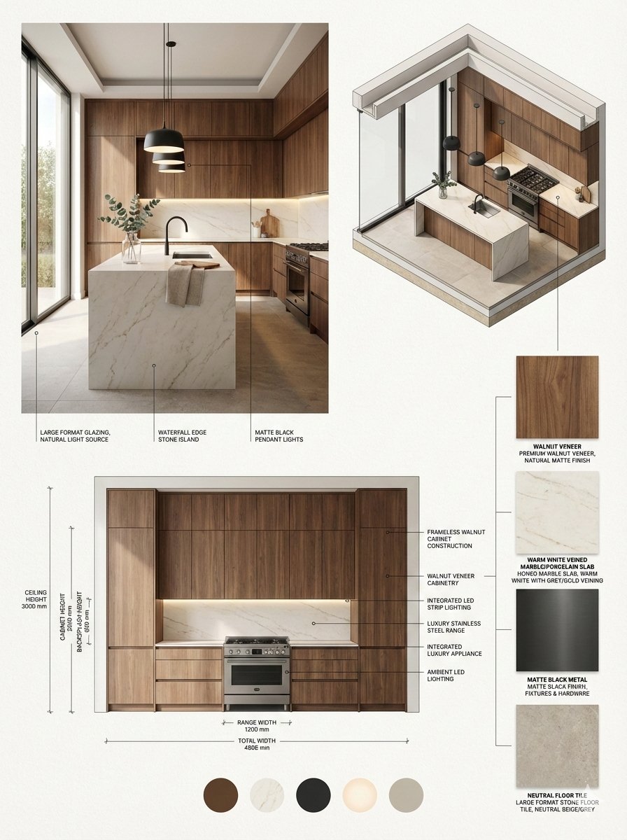 Ultra-photorealistic luxury modern [Scandinavian] kitchen in a [warm minimal] style with [premium materials], [natural sunlight] entering from an