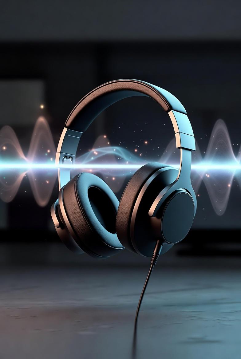 Ultra-realistic cinematic product shot of [over-ear premium headphones] floating mid-air, cushions and materials ultra-detailed. [Sound-wave light effects and subtle particles] frozen around the headphones. [Clean dramatic lighting]