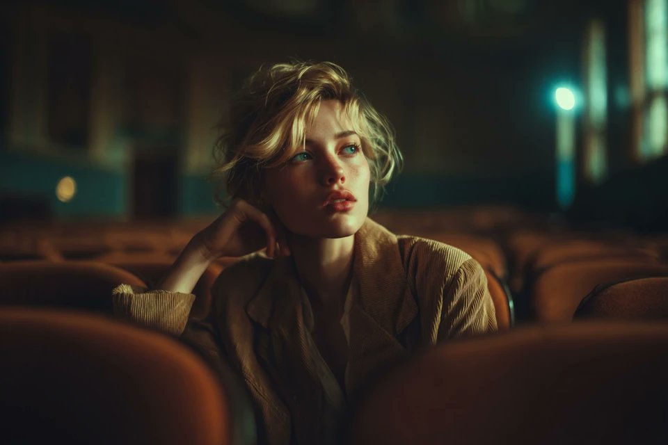 Cinematic portrait of [a person], [a vintage street], soft ambient lighting, [warm earthy tones], nostalgic [1970s] wardrobe, reflective mood, gentle film grain texture, shallow depth of field, vintage editorial photography style