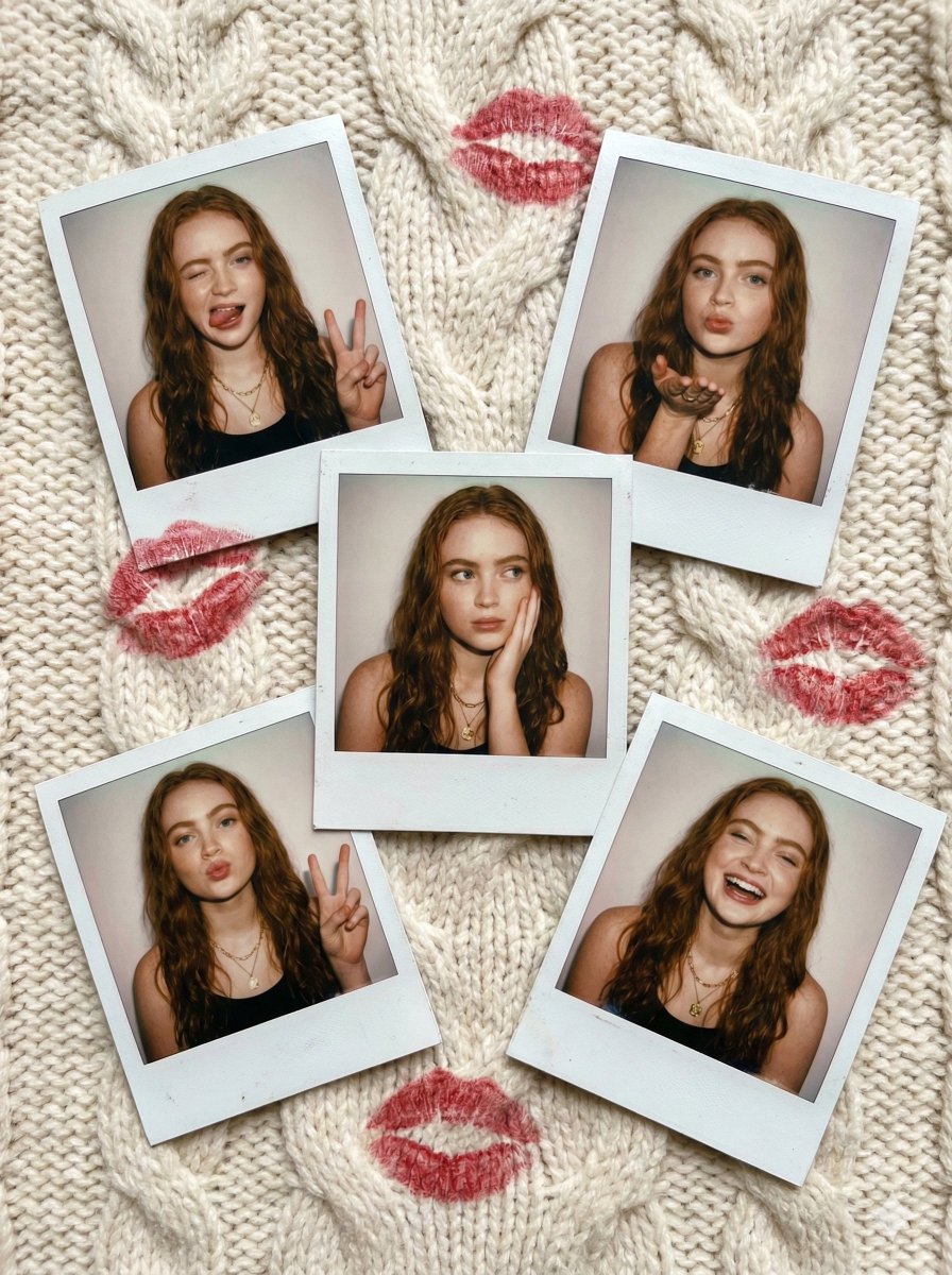A collection of [five] [vintage Polaroid instant photographs] featuring the same young [Sadie pink woman], arranged casually on a [textured surface].