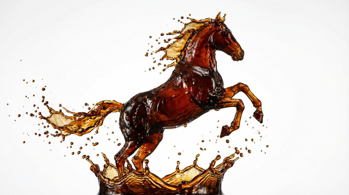 咖啡飞溅成物体形状的凝固瞬间。纯白色背景,影室灯光,带戏剧性高光,超高速摄影