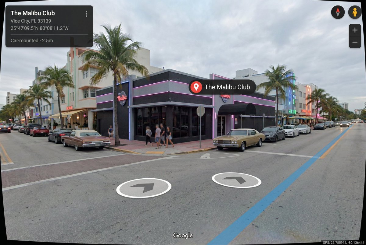 此提示生成指定地点的超现实谷歌街景截图,包含现代UI元素、模糊人脸和车顶视角。它旨在创造与虚构世界相符的逼真、超详细环境。