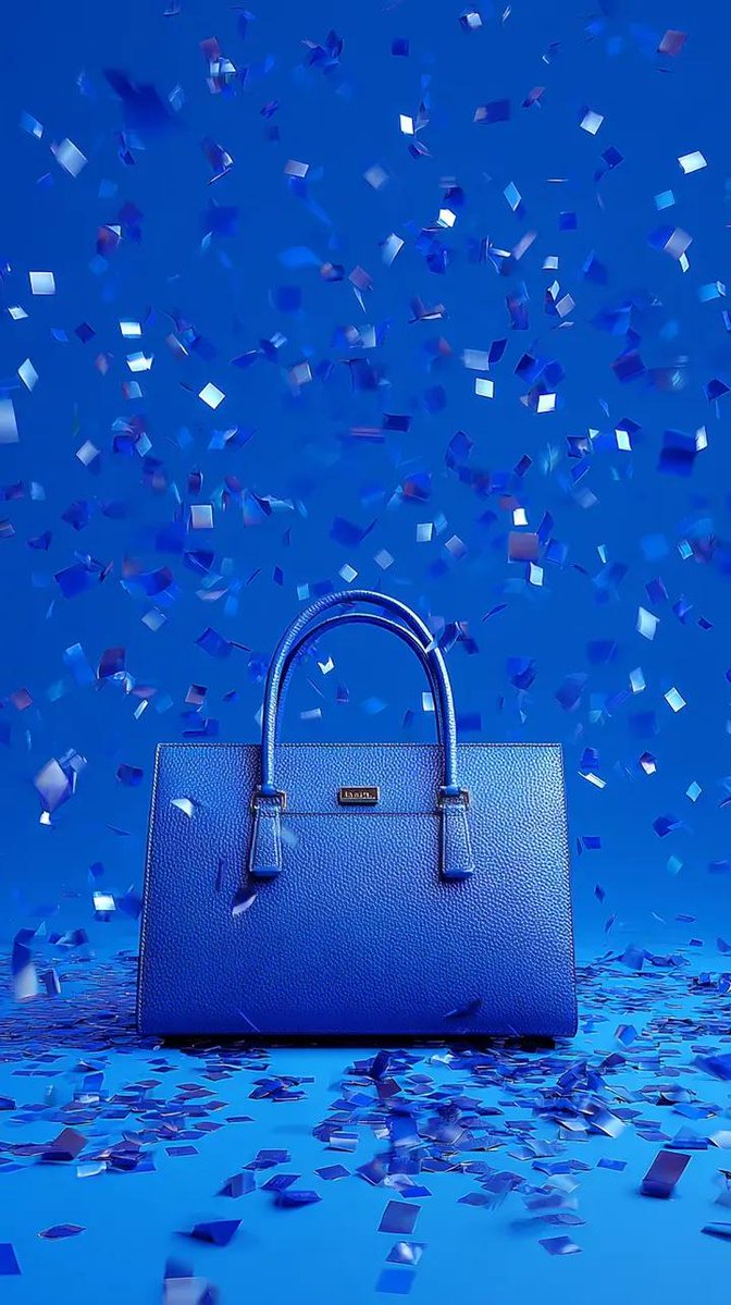 现代设计师钴蓝色手提包平铺在一个无限的纯蓝色表面上,周围环绕着蓝色纸屑,蓝色纸屑飘落,干净无缝的钴蓝色背景,高端时尚产品摄影风格,柔和漫射光,优雅反射,锐利对焦,奢华美学,赋能的冷色调。
