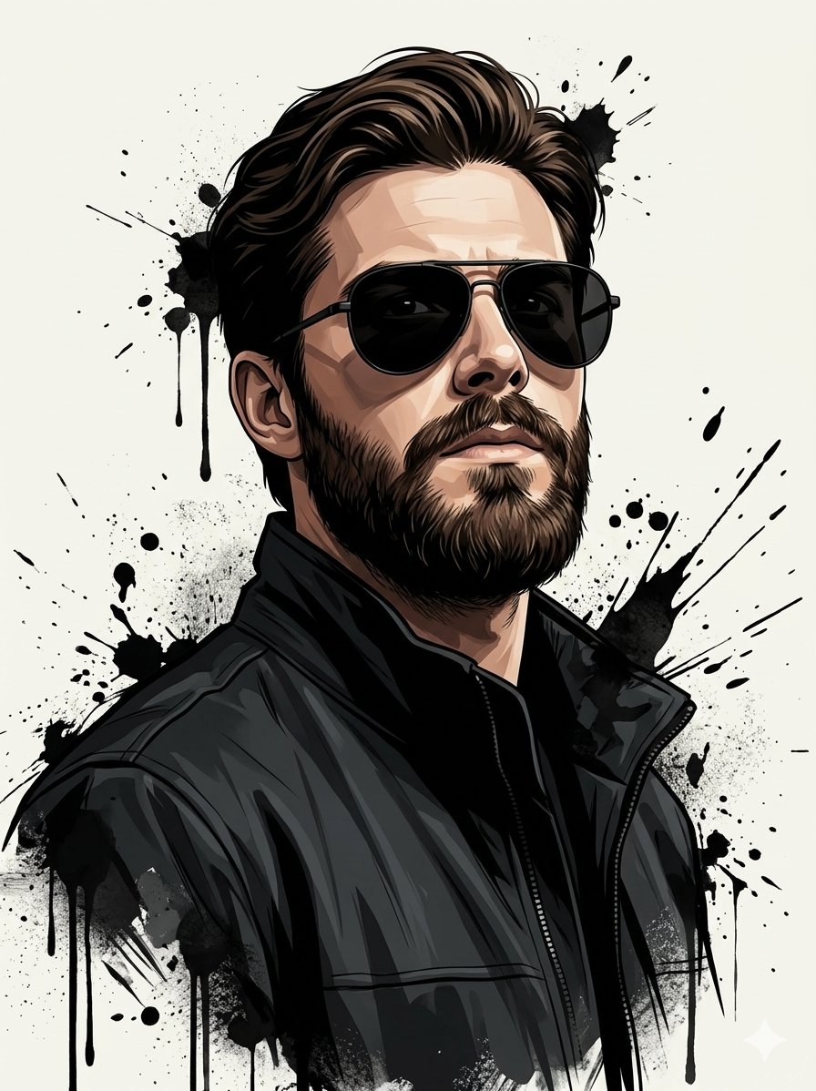 一位时尚的男士,留着浓密的胡须,戴着黑色墨镜,穿着深色街头风夹克,略微向上看,姿态自信。简约的米白色背景,带有艺术性的墨水飞溅和颜料滴落。现代都市插画风格,半写实数字绘画,锐利的面部细节,高对比度光照,柔和阴影,垃圾摇滚纹理效果,干净构图,海报设计美学,超细节,4K分辨率。