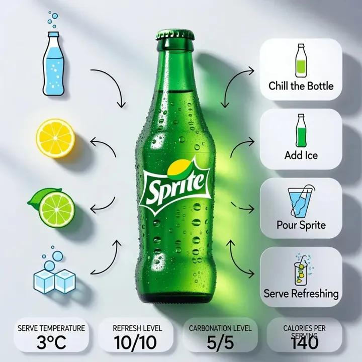 一张现代、简洁的[产品信息图],构图中心是一个冰镇的[雪碧瓶]。瓶子直立于[简约表面],覆盖着[冰冷的凝结水滴和轻微的霜]。标志性的绿色雪碧标签