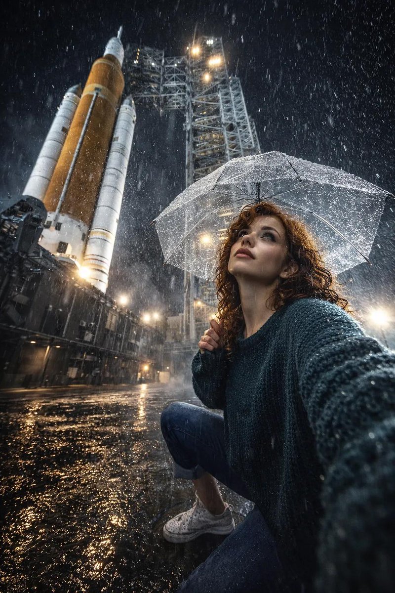 这个提示生成一张电影感十足、超现实的雨夜女性肖像。它捕捉了她在透明雨伞下沉思的表情,背景是高耸的建筑。