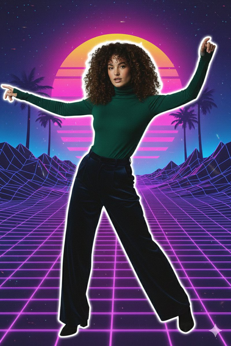 对原始图像中的女性进行全身编辑。她现在摆出充满活力、精力充沛的姿势,双臂伸展,如同跳舞。她保留着她的[卷曲]头发,[绿色高领毛衣],以及[深色天鹅绒长裤]。主体被勾勒出来