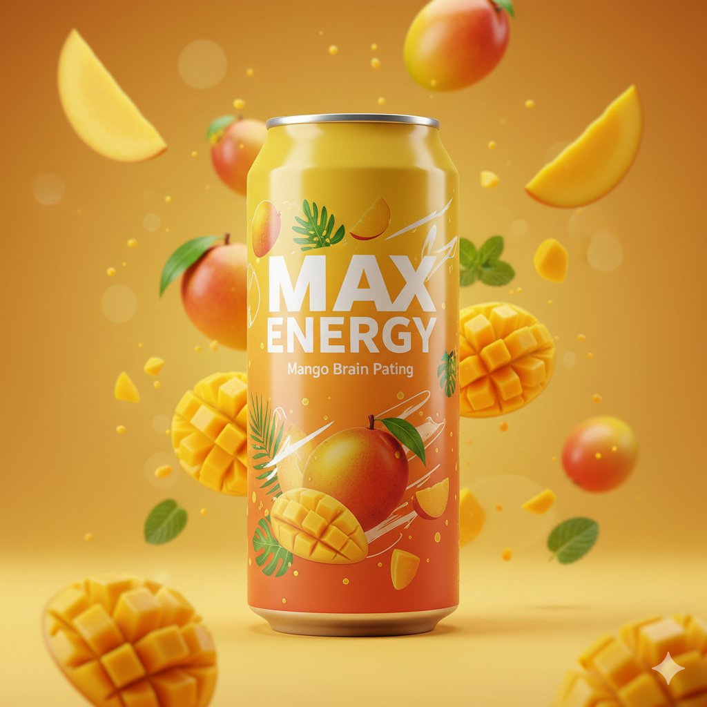 "prompt": "一张芒果味能量饮料罐的优质工作室产品照片。圆柱形铝罐垂直立于画面中央,呈现充满活力的金黄色至橙色渐变。大胆的白色字体显示着标志 “{argument name=\"logo\" default=\"MAX ENERGY\"}”,下方印有文字 “{argument name=\"flavor text\" default=\"Mango Brain Pating\"}”。罐身表面饰有现代芒果插画和热带风情点缀。罐身周围,多汁成熟的芒果片和翠绿的小薄荷叶漂浮在半空中,营造出清爽的能量爆发效果。一些芒果片清晰锐利,而另一些则柔和模糊,以暗示动感。背景是温暖的黄橙色渐变,增强了热带色彩的调性。明亮专业的摄影棚灯光在罐身上营造出光泽高光,并突出了芒果新鲜多汁的质感。干净、现代、高端的商业美学。",