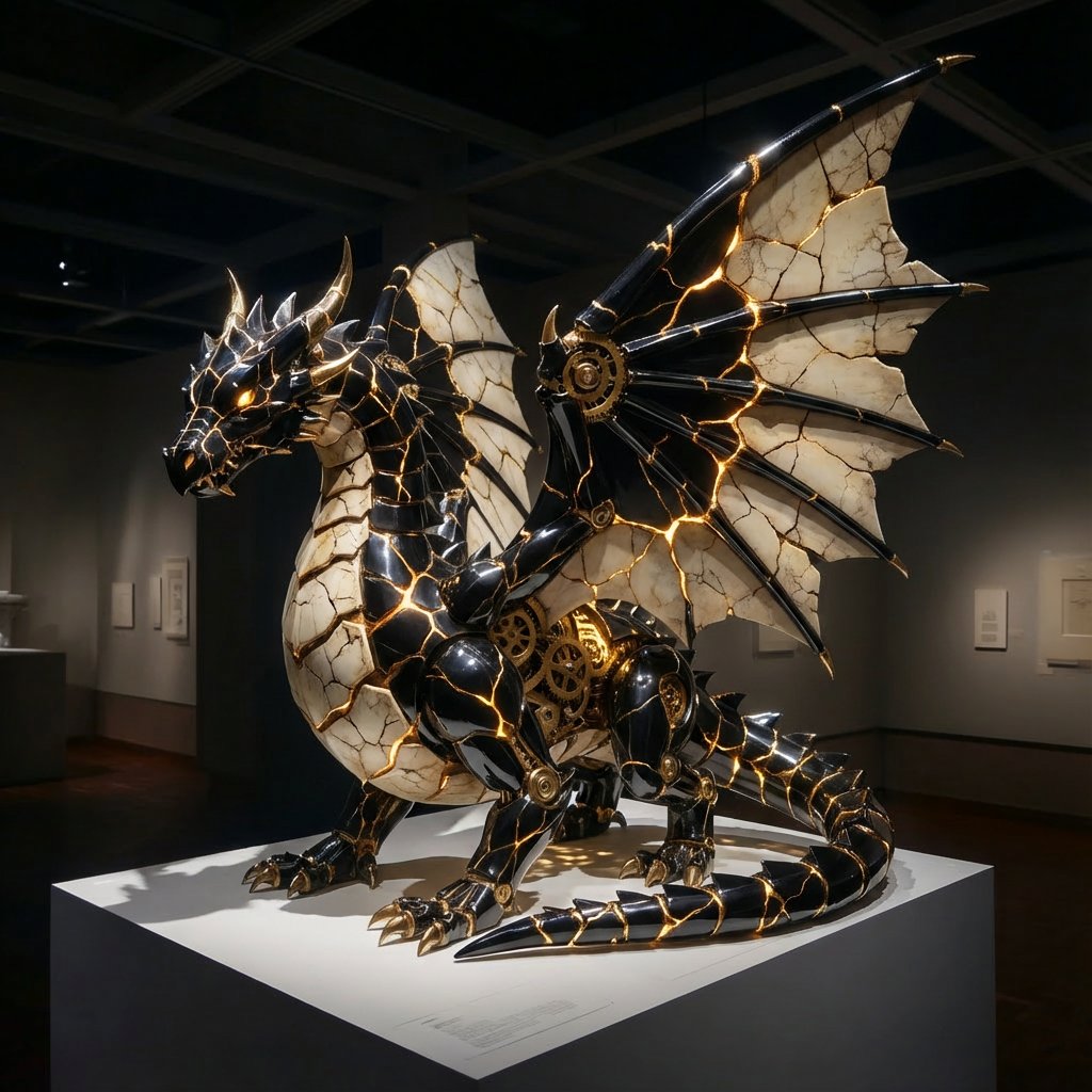 - 技术规格:高级 Houdini/Blender 模拟逻辑。内部齿轮在黑曜石内部转动,金色光芒透过金缮裂缝闪烁。