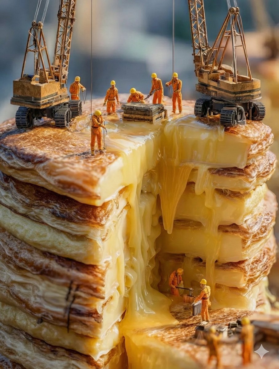 此提示生成一张超现实的巨型抹茶煎饼摩天大楼图像,由微型工人使用迷你起重机建造,强调异想天开而又细节丰富的场景。